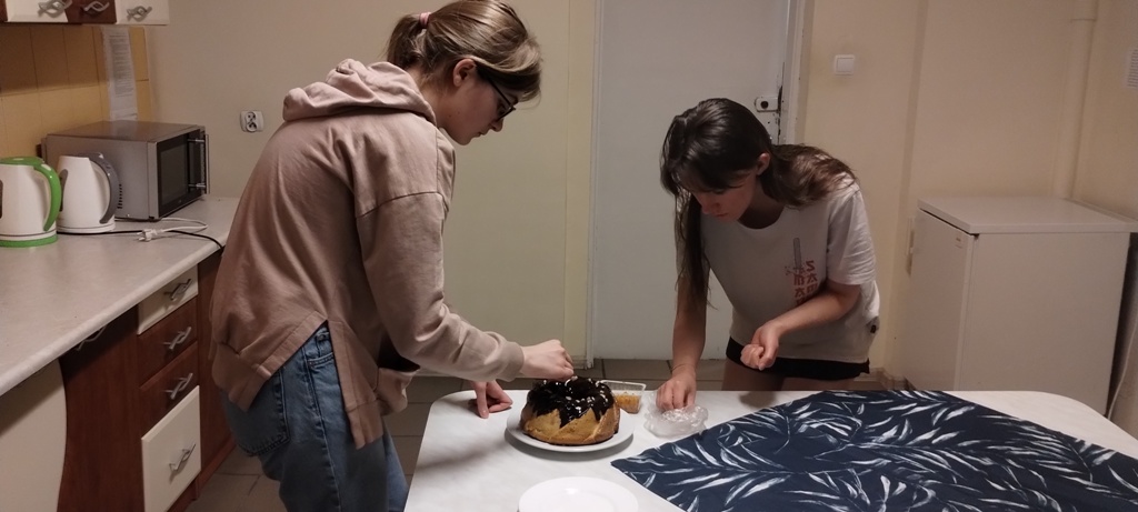 Upieczona rumiana i pachnąca babka została polana ciemną czekoladą oraz ozdobiona orzechami włoskimi. Degustacja internackich wypieków zawsze cieszy się dużą popularnością wśród naszej młodzieży.
