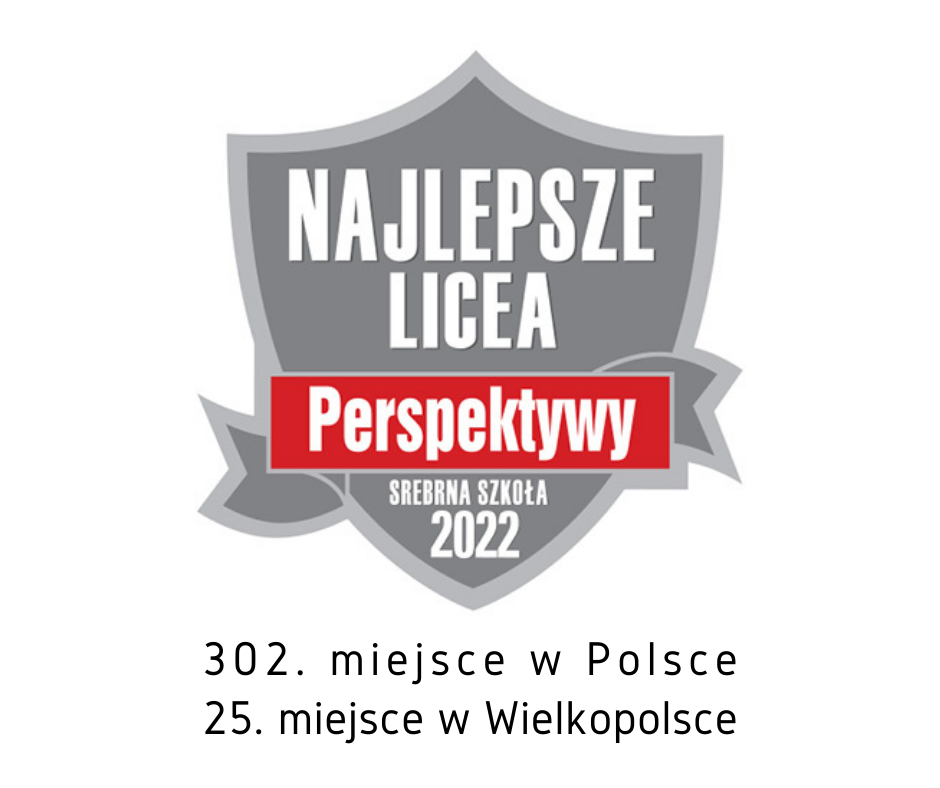 Z przyjemnością informujemy, że w ogólnopolskim rankingu PERSPEKTYWY.PL „Najlepsze licea w Polsce 2022” zajęliśmy wysokie 302 miejsce (o ponad 300 pozycji wyższe niż w roku ubiegłym), oraz 25 miejsce w Wielkopolsce.