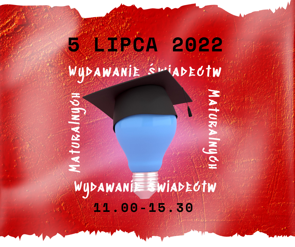 5 lipca 2022 r. w godzinach 11.00 – 15.30 będą wydawane świadectwa maturalne w salach lekcyjnych na parterze szkoły.