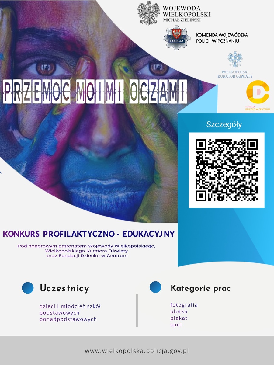 👮‍♂️🚔👮Komenda Wojewódzka Policji w Poznaniu pod patronatem Wojewody Wielkopolskiego, Wielkopolskiego Kuratora Oświaty oraz Fundacji „Dziecko w Centrum” ogłasza konkurs pod nazwą „PRZEMOC MOIMI OCZAMI”.