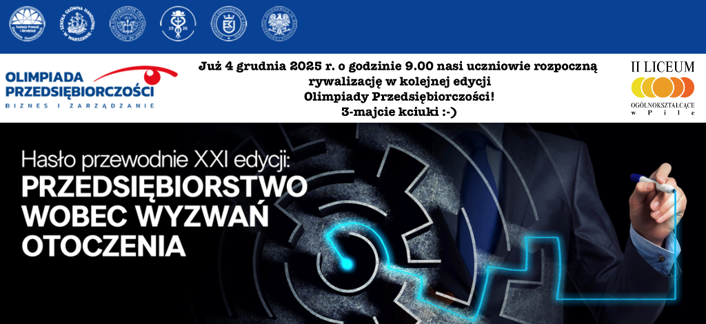 Już 4 grudnia 2025 o godzinie 9.00 ekipa z II LO w Pile po raz kolejny wskakuje na przedsiębiorczy tor i rusza do walki w Olimpiadzie Przedsiębiorczości!