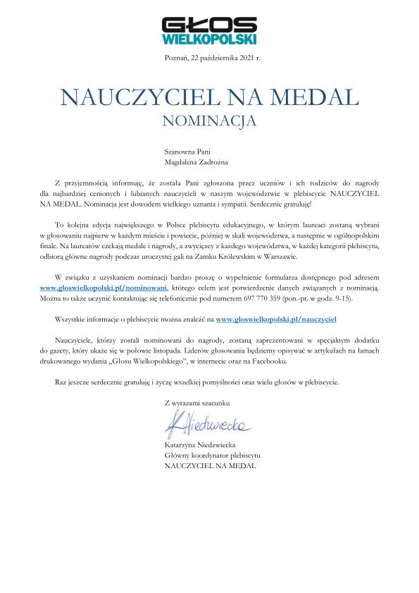 Jednocześnie nominację do tytułu ????NAUCZYCIEL NA MEDAL???? otrzymała:
