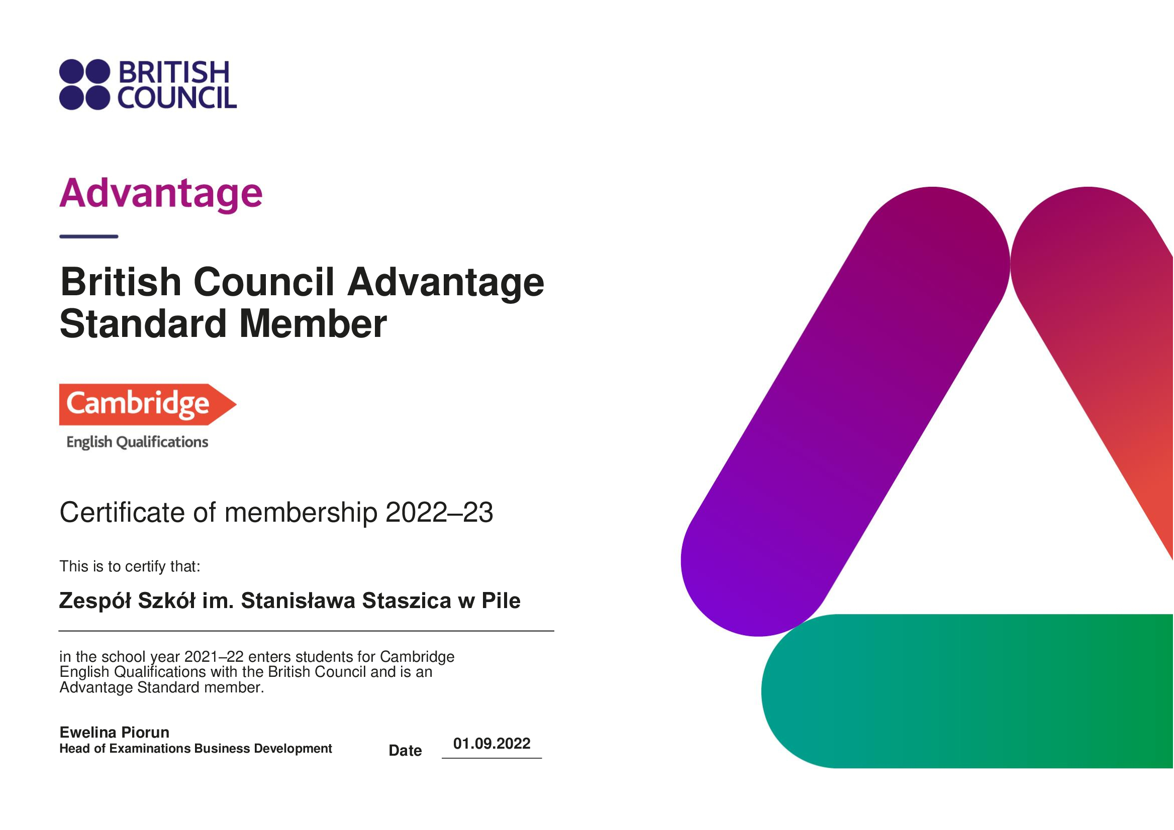 Z dumą informujemy, że nasza szkoła otrzymała od British Council Polska 🇬🇧ODZNAKĘ i CERTYFIKAT🇬🇧 potwierdzający uczestnictwo w programie na poziomie Advantage Standard.