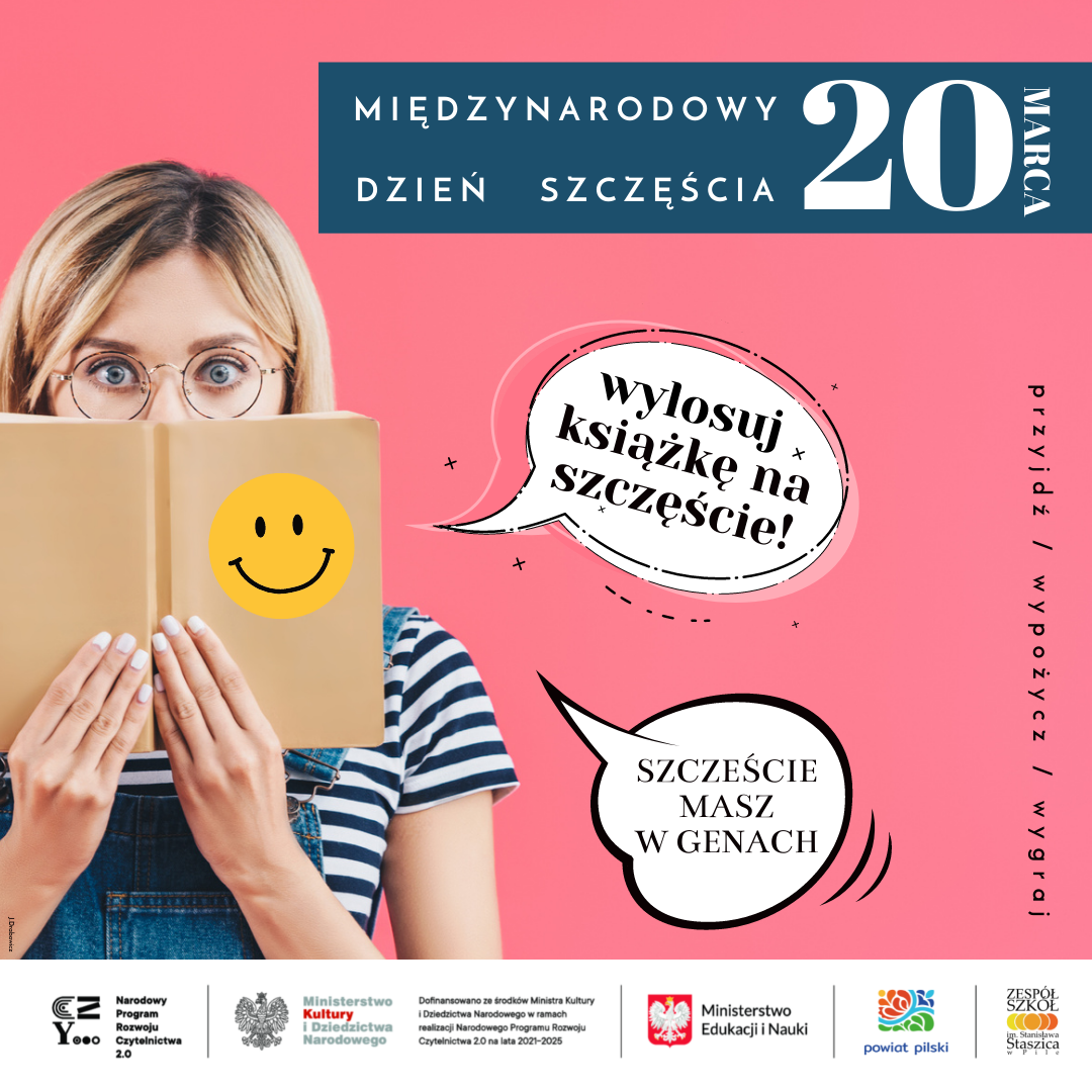Z okazji Międzynarodowego Dnia Szczęścia biblioteka szkolna zaprasza marca wszystkich czytoholików do udziału w Książkowej Loterii Szczęścia. Tego dnia każdy, kto wypożyczy książkę, będzie mógł złapać los szczęścia i wziąć udział w losowaniu nagród książkowych zakupionych w ramach NPRCz 2.0 pod patronatem Ministerstwa Edukacji i Nauki.