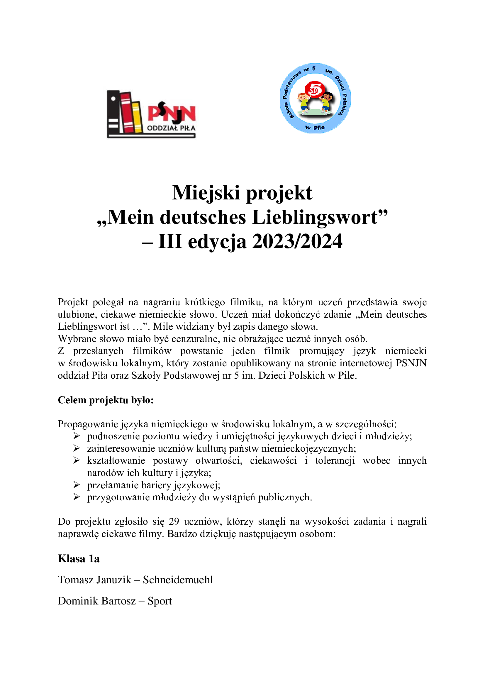 Do projektu zgłosiło się 29 uczniów, którzy stanęli na wysokości zadania i nagrali naprawdę ciekawe filmy. Z przesłanych filmików powstanie jeden filmik promujący język niemiecki w środowisku lokalnym, który zostanie opublikowany na stronie internetowej PSNJN oddział Piła oraz Szkoły Podstawowej nr 5 im. Dzieci Polskich w Pile.