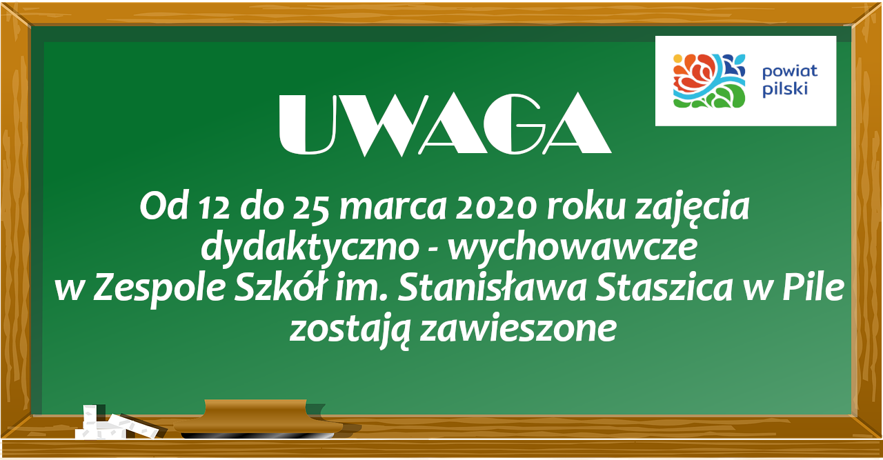 Od 12 do 25 marca 2020 roku zajęcia dydaktyczno - wychowawcze w Zespole Szkół im. Stanisława Staszica w Pile zostają zawieszone.