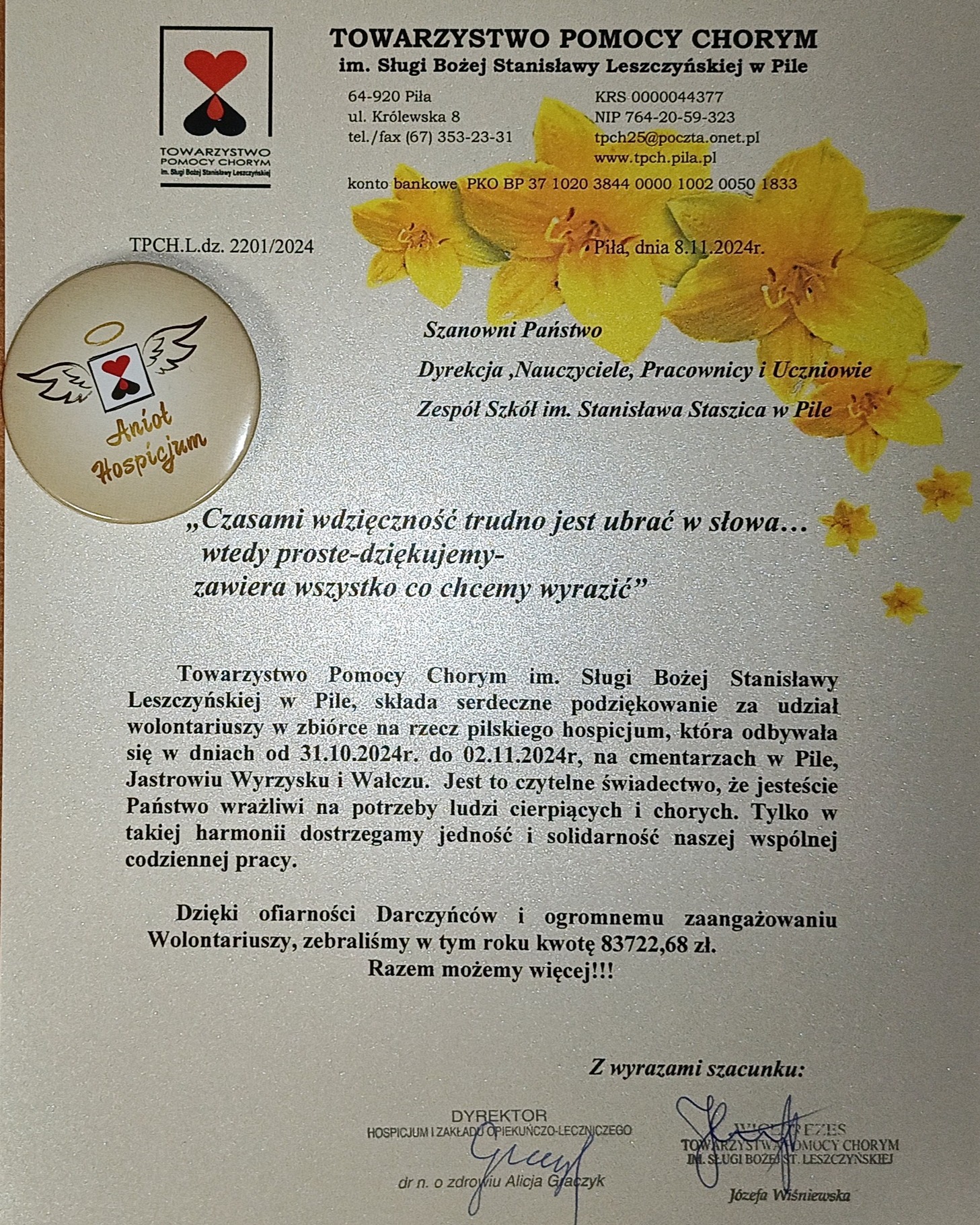 Z tego miejsca należy jeszcze raz podkreślić i docenić zaangażowanie młodzieży - Naszych Wolontariuszy, dzięki którym tegoroczna zbiórka okazała się dużym sukcesem.