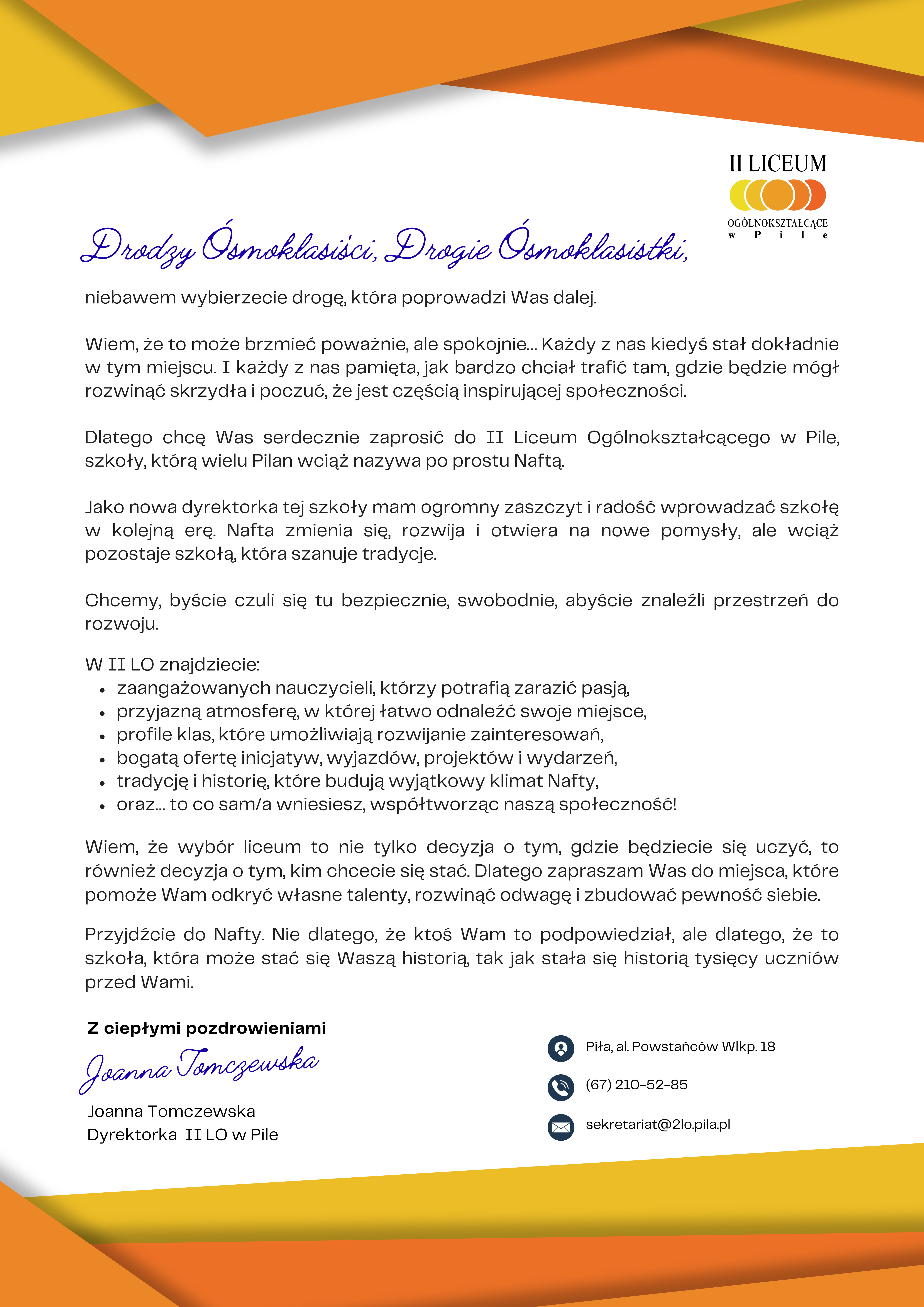 W imieniu Pani Dyrektor Joanny Tomczewskiej zapraszamy do zapoznania się z listem skierowanym specjalnie do Was.