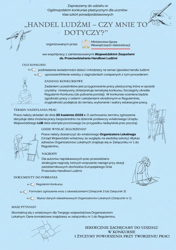 Ministerstwo Spraw Wewnętrznych i Administracji, we współpracy z zainteresowanymi Wojewódzkimi Zespołami ds. Przeciwdziałania Handlowi Ludźmi, w dniu 2 marca 2026 r. ogłosiło ogólnopolski konkurs plastyczny skierowany do uczniów szkół ponadpodstawowych.