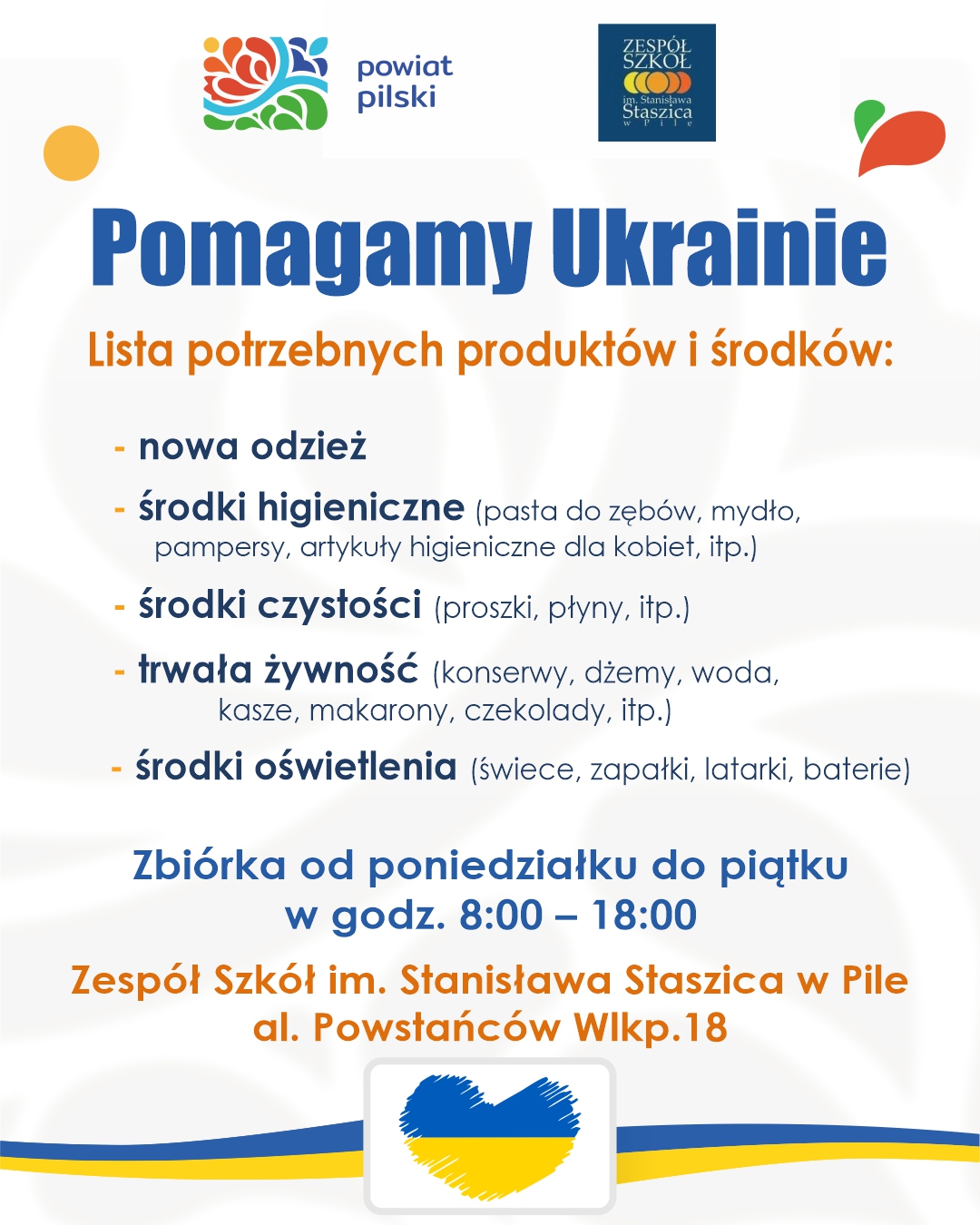 W związku z ostatnimi wydarzeniami w Ukrainie nie możemy pozostać obojętni! Dołączamy do organizowanej przez Powiat Pilski zbiórki, która jest wyrazem solidarności z naszymi sąsiadami, a jednocześnie zapewni konkretną pomoc poszkodowanym na miejscu. Nasze wsparcie może zmienić los Ukraińców, którzy zostali dotknięci wrogimi działaniami Rosji. Zachęcamy do pomocy.