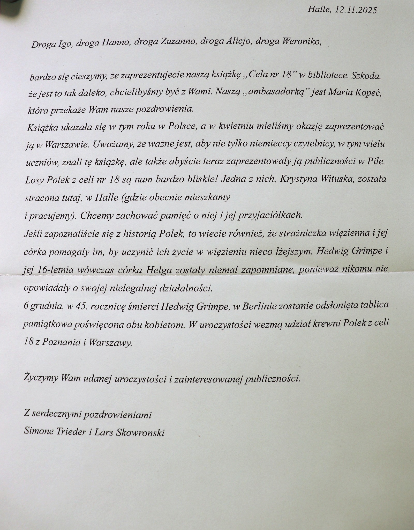 wzięły udział w poruszającym wydarzeniu w Powiatowej i Miejskiej Biblioteka Publiczna im. Pantaleona Szumana w Pile. Spotkanie poświęcone było polskiemu wydaniu książki Simone Trieder i Larsa Skowronskiego "Cela nr 18. Historia odwagi i przyjaźni".